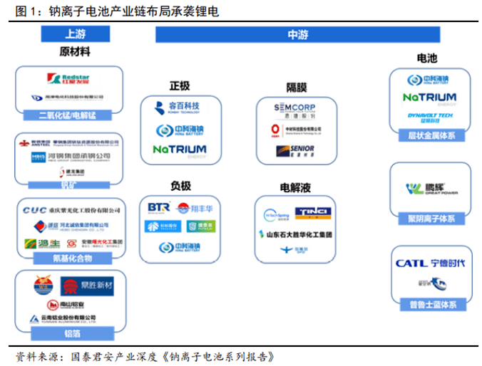 鈉電產(chǎn)業(yè)鏈布局承襲鋰電,利于產(chǎn)業(yè)化快速導(dǎo)入。我國(guó)鈉離子電池產(chǎn)業(yè)鏈還處于初級(jí)階段,產(chǎn)業(yè)布局尚不成熟。鈉離子電池產(chǎn)業(yè)鏈結(jié)構(gòu)與鋰電類(lèi)似,包括上游資源企業(yè)、中游電池材料及電芯企業(yè)。