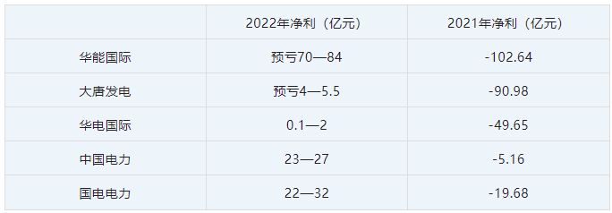 華電國際預(yù)計(jì)2022年實(shí)現(xiàn)歸母凈利潤0.1億元至2億元,較上年同期(重述后)減虧49.92億元到51.82億元。國電電力發(fā)布業(yè)績預(yù)告,預(yù)計(jì)2022年全年盈利22億元至32億元,同比上年增加218.55%至272.43%。