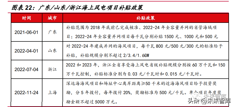 若考慮地補,廣東的海上風(fēng)電項目 LCOE 可下降 10%。2022 年,若假設(shè)廣東 省海上風(fēng)電的補貼標準為 1500 元/kW,若考慮地補,LCOE 降 0.05 至 0.42 元/kWh, IRR 提升 1.0 pct 至 5.9%;山東省 2022 年海上風(fēng)電的補貼標準為 800 元/kW,若 考慮地補,LCOE 降 0.03 至 0.61 元/kWh, IRR 提升 0.4 pct 至 1.7%。
