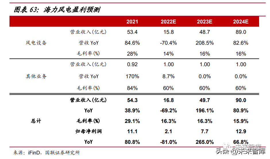 海風(fēng)法蘭出貨有望實現(xiàn)高增,新業(yè)務(wù)拓展順利。受益于公司 5 萬噸 12MW 海 上風(fēng)電機組大型精加工鍛件項目產(chǎn)能釋放,再結(jié)合海上風(fēng)電裝機需求回暖,預(yù)計 2023-24 公司海風(fēng)法蘭出貨或達到 5/7 萬噸,法蘭整體出貨有望達 9.5/12 萬噸。軸 承布局順利,公司軸承工廠于 22 年 7 月開始投產(chǎn),預(yù)計 2023-24 年出貨 2500/3300 套,齒輪箱鍛件項目仍處于籌備階段,預(yù)計 24 年有望確認約 3 億元收入。我們預(yù)計 2022-24 年公司歸母凈利潤分別為 1.05/4.50/7.77 億元,同比76.30%/329.31%/72.87%;EPS 分別為 0.24/1.02/1.76 元/股。