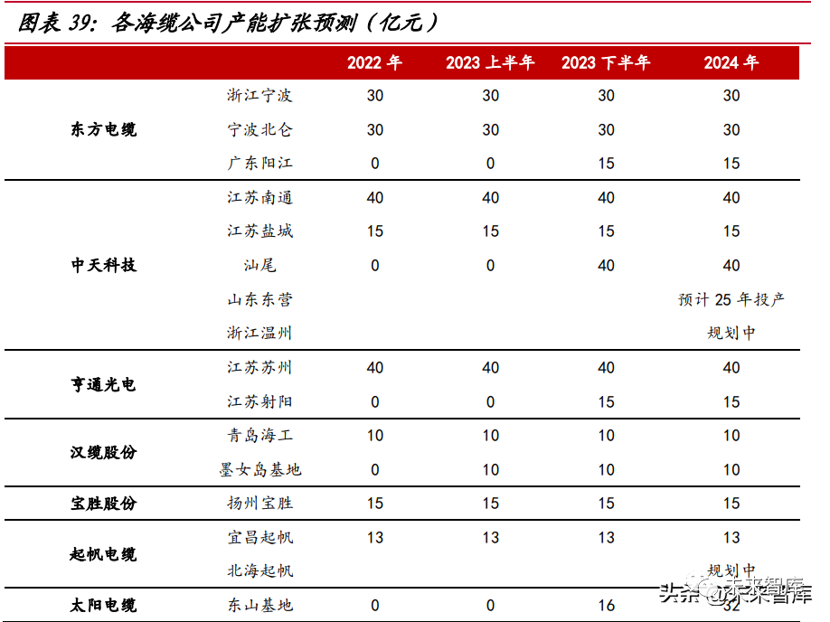 疫情因素減弱,疊加海纜較高的毛利率,海纜企業(yè)擴大產(chǎn)能的動機較強。東方電 纜陽江基地、中天科技(維權(quán))汕尾基地和亨通光電射陽基地 2023 年下半年投產(chǎn),預(yù)計分別 擴大產(chǎn)能 15 億、40 億和 15 億;漢纜股份墨女島已建成,投產(chǎn)時間預(yù)計在 23 年初, 擴產(chǎn)可達 10 億;太陽電纜正在建設(shè)東山海纜生產(chǎn)基地,產(chǎn)能可達 32 億。