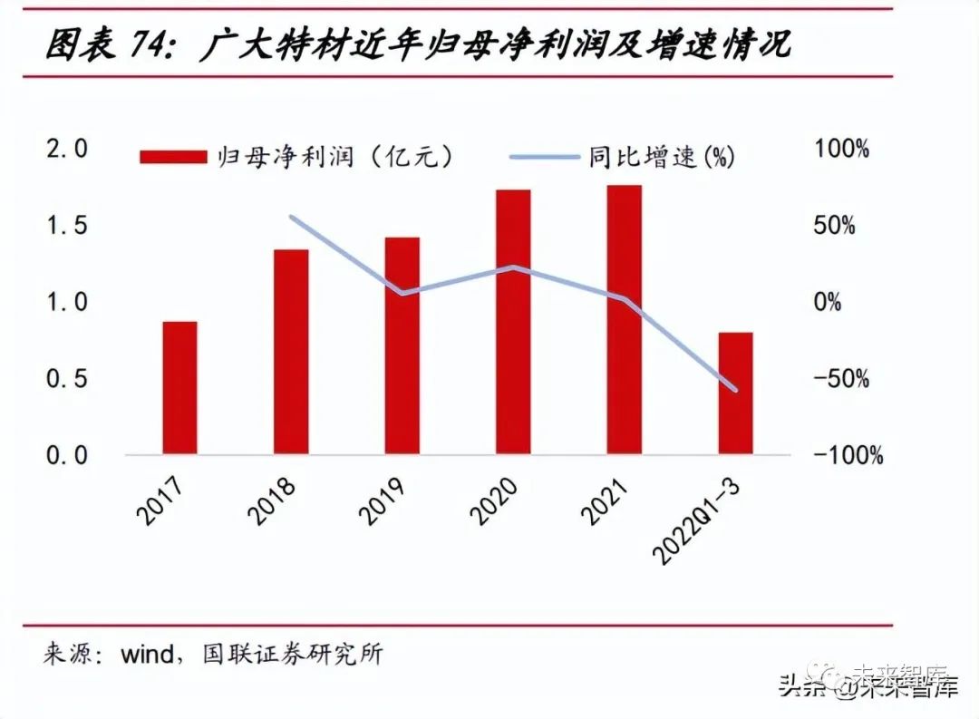 廣大特材于 2006 年成立,主營業(yè)務(wù)為高端特鋼材料和風(fēng)電零部件。公司于 2019 年近進軍風(fēng)電鑄件業(yè)務(wù),截至 2022 年擁有大兆瓦風(fēng)電鑄件產(chǎn)能 10-12 萬噸, 2023 年中期將形成 20 萬噸大兆瓦風(fēng)電鑄件產(chǎn)能。2022 年 10 月公司可轉(zhuǎn)債項目 獲證監(jiān)會批準,擬投資 11.5 億元建設(shè) 8.4 萬件風(fēng)電齒輪箱核心精密零部件產(chǎn)能。2022 年前三季度公司營業(yè)收入同比有所上升 21.85%,但由于風(fēng)電行業(yè)總體 需求減弱,再結(jié)合疫情反復(fù)、鋼材價格總體維持高位,前三季度歸母凈利潤同比下 降 57.91%。