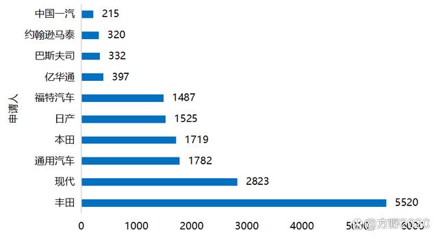 全球車用氫能技術(shù)領(lǐng)域?qū)@暾埩颗琶笆纳暾埲巳鐖D6所示。從圖中可以看到,目前車用氫能技術(shù)主要掌握在眾多車企手中,其中較典型的如日本豐田和本田、韓國現(xiàn)代、美國通用和福特以及中國一汽,而北京億華通作為唯一的非車企型企業(yè)列入其中,具有較佳的研發(fā)實(shí)力。
