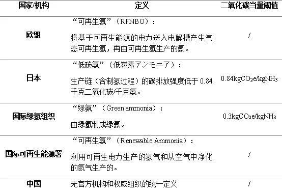 目前,國內關于“綠氨”尚無官方機構和權威組織的統一定義。行業(yè)內具備相關發(fā)聲,國內企業(yè)對綠氨的定義主要關注其原料氫是否由可再生能源電力制取,對生產過程中的碳排沒有明確的要求。