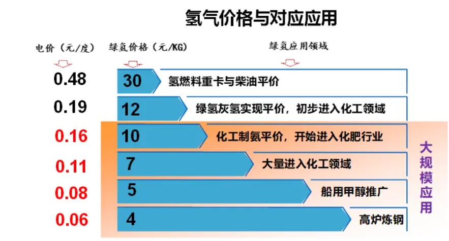 當(dāng)光伏電價(jià)降到0.19元每度時(shí),對(duì)應(yīng)的綠氫價(jià)格是12元每公斤,這個(gè)時(shí)候的綠氫價(jià)格跟最便宜的煤制氫價(jià)格打平,一些單獨(dú)需要?dú)錃獾幕ち鞒?,可以選擇綠氫,雖然整體應(yīng)用并不多。