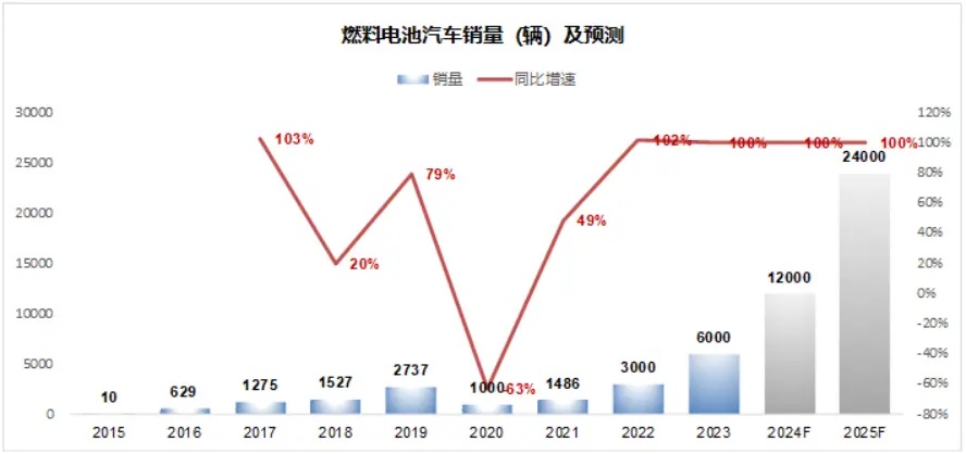 假如到2025年完成5萬(wàn)輛的保有量,未來(lái)兩年需要燃料電池汽車(chē)銷(xiāo)量翻倍,2024年1.2萬(wàn)輛,2025年2.4萬(wàn)輛。市場(chǎng)上很多人質(zhì)疑這個(gè)目標(biāo)是不是能完成。