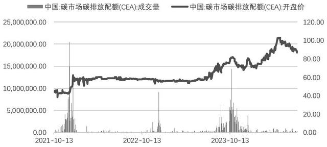 從碳排放權(quán)交易價(jià)格走勢(shì)看,2021年7月16日至2023年7月16日的兩年時(shí)間,基本穩(wěn)定在60元/噸。上市首日,開(kāi)盤(pán)價(jià)為48元/噸,9點(diǎn)30分首筆全國(guó)碳排放配額交易撮合成功,價(jià)格為52.78元/噸,總共成交16萬(wàn)噸,交易額為790萬(wàn)元。當(dāng)日收盤(pán),累計(jì)成交410萬(wàn)噸碳排放配額,成交額超過(guò)2.1億元,收盤(pán)價(jià)為51.23元/噸,較48元/噸上漲6.73%。