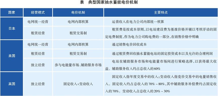 現(xiàn)階段,日本抽水蓄能電站主要采用租賃制(電源開發(fā)商參與)和內(nèi)部核算制(電力公司主導);美國則以電網(wǎng)統(tǒng)一運營模式為主(抽蓄電站約占70%),輔以租賃運營和少量獨立運營,直接參與電力市場的比例較低;英國抽水蓄能電站雖然總體規(guī)模有限,但其高度市場化的發(fā)電側環(huán)境使其能夠作為獨立成員參與市場,其收入明確區(qū)分為年度交易的固定收入與競價交易的變動收入兩部分,構成典型的兩部制電價模式(見表)。