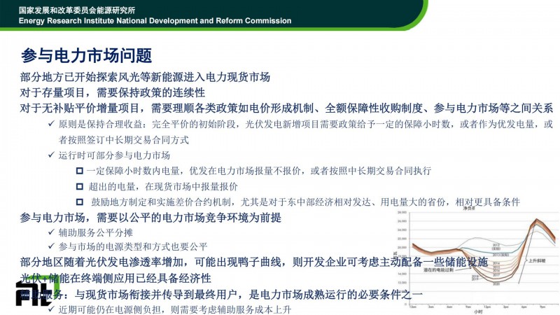 對于風(fēng)電、光伏參與市場化交易,時老師認為:1)對于存量項目,要保證政策的延續(xù)性;2)對于新增項目,要建立公平的電力市場環(huán)境為前提,做好輔助服務(wù)費用分攤、參與的類型和方式也要公平。