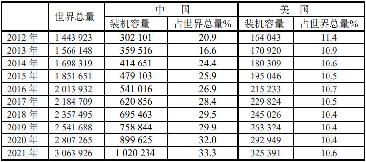 2012~2021年中美兩國再生能源裝機(jī)容量(單位:MW)