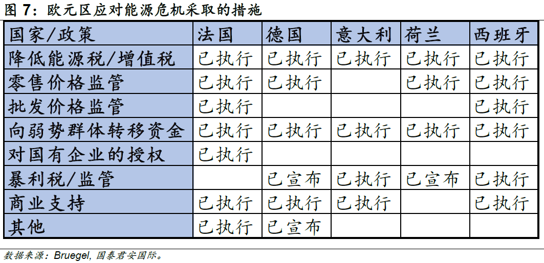 從總量政策來看,財政端的支持在很大程度上減輕了能源危機(jī)的沖擊。為應(yīng)對俄烏沖突帶來的能源問題,歐洲各國不約而同地采取了多種財政措施。根據(jù)Bruegel的統(tǒng)計,歐洲各國已經(jīng)撥款7,055億歐元用于緩解能源危機(jī)帶來的影響。歐盟撥款總計6,004億歐元,其中德國支出2,640億歐元,占2021年GDP的7.4%;英國撥款970億歐元,占2021年GDP的3.5%。