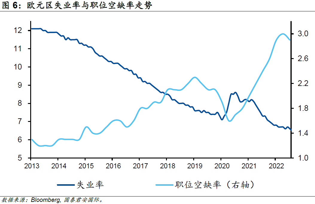 如果說天氣在很大程度上幫助了歐洲人,但歐洲經(jīng)濟(jì)超預(yù)期的根本原因大概率不是因為幸運(yùn)或者天氣。進(jìn)一步來看,勞動力市場的火熱意味著經(jīng)濟(jì)維持著較好的動能。一方面,即使在能源價格高企的去年上半年,職位空缺率都處于上行趨勢中;另一方面,在緊張的企業(yè)用工環(huán)境中,歐元區(qū)的失業(yè)率開始走低,并迭創(chuàng)歷史低點。在之前通脹大幅高走的背景下,歐元區(qū)多個國家的工會已經(jīng)通過罷工的形式確定了未來的漲薪方案。與此同時,歐洲央行(ECB)基于通脹補(bǔ)償?shù)目紤],在2022年12月的最新預(yù)測中將2022-2024年的累積工資增長較2022年9月的預(yù)測值上調(diào)1.4個百分點。