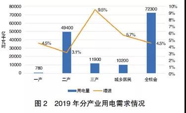 分產業(yè)來看,第三產業(yè)和城鄉(xiāng)居民用電成為拉動用電需求的主力軍(見圖2)。2019年第一產業(yè)用電量為780億千瓦時,同比增長4.5%,保持平穩(wěn)增長;2019年第二產業(yè)用電量4.94萬億千瓦時,同比增長3.1%,占全社會用電量的比重同比降低0.9個百分點;2019年第三產業(yè)用電量1.19萬億千瓦時,同比增長9.5%,2019年城鄉(xiāng)居民生活用電量1.02萬億千瓦時,同比增長5.7%,第三產業(yè)和城鄉(xiāng)居民生活用電分別拉動全社會用電量增長1.5和0.8個百分點,合計拉動2.3個百分點,高于第二產業(yè)拉動的2.1個百分點。第三產業(yè)和城鄉(xiāng)居民生活用電量對全社會用電量增長的貢獻率合計達到51.0%,比第二產業(yè)對全社會用電量增長的貢獻率高3.8個百分點,其中第三產業(yè)貢獻率提高尤為明顯,為10.1個百分點。