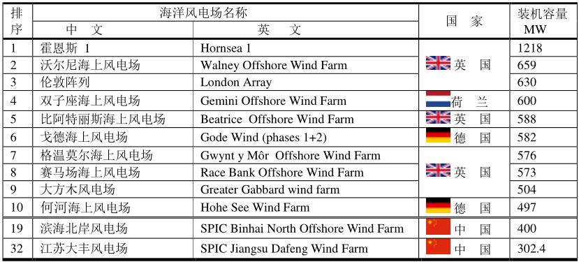 海洋最大的風(fēng)電場在英國倫敦陣列。中國最大的海上風(fēng)電場是濱海北岸風(fēng)電場(SPIC Binhai North Offshore Wind Farm),世界排序19,裝機(jī)容量400MW。SPIC是State Power Investment Corporation(國家電力投資公司)的縮寫。