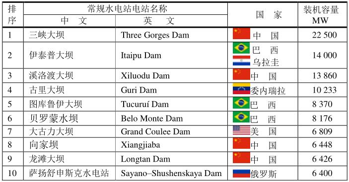常規(guī)水電站是利用天然河流、湖泊等水能的發(fā)電站。目前世界上最大的水力發(fā)電站是在中國的三峽發(fā)電站(Three Gorges Dam),裝機(jī)容量達(dá)22500MW。