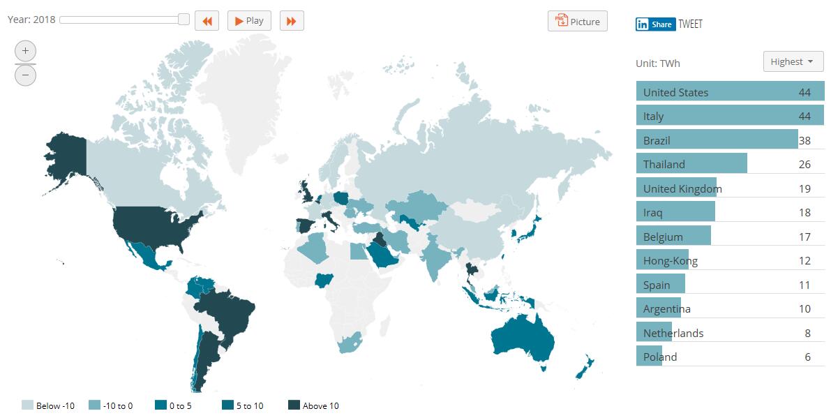 2018年全球電力進(jìn)口國的貿(mào)易量(單位:TWh)