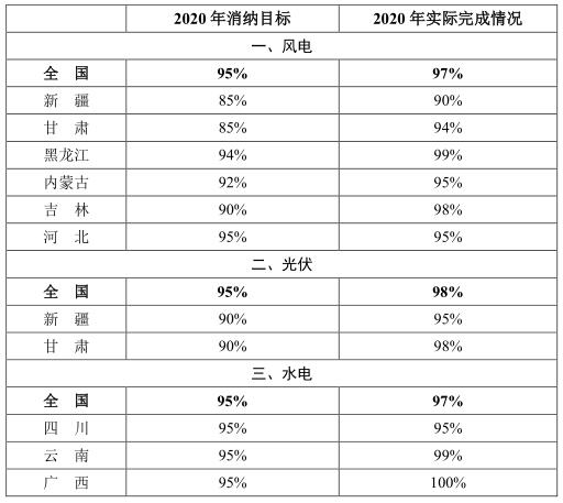 根據(jù)2018年國(guó)家發(fā)展改革委、國(guó)家能源局印發(fā)的《清潔能源消納行動(dòng)計(jì)劃(2018-2020年)》(發(fā)改能源規(guī)〔2018〕1575號(hào)),所確定的分年度風(fēng)電、光伏和水電消納目標(biāo),2020年全國(guó)平均風(fēng)電利用率97%,超過(guò)2020年風(fēng)電利用率目標(biāo)2個(gè)百分點(diǎn),重點(diǎn)省區(qū)全部達(dá)到了2020年消納目標(biāo);全國(guó)平均光伏發(fā)電利用率為98%,超過(guò)2020年利用率目標(biāo)3個(gè)百分點(diǎn),重點(diǎn)省區(qū)全部達(dá)到了2020年消納目標(biāo);全國(guó)主要流域水能利用率97%,超過(guò)2020年利用率目標(biāo)近2個(gè)百分點(diǎn),重點(diǎn)省區(qū)全部達(dá)到了2020年消納目標(biāo)。