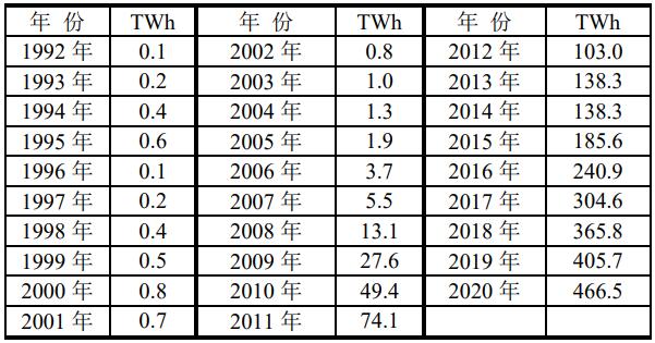 中國風電場發(fā)電量進程(單位:TWh)