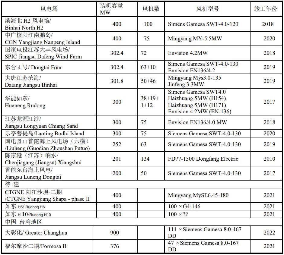 中國大于200 MW運行的海上風電場