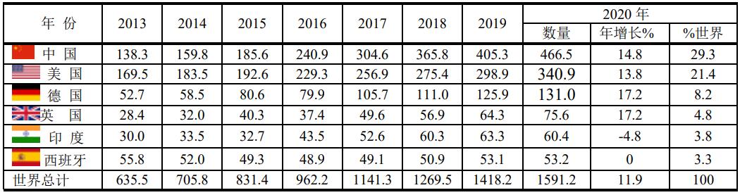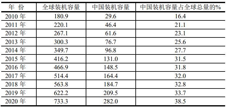 根據(jù)BP2021年的統(tǒng)計,中國裝機容量占全球總量的百分率如表。