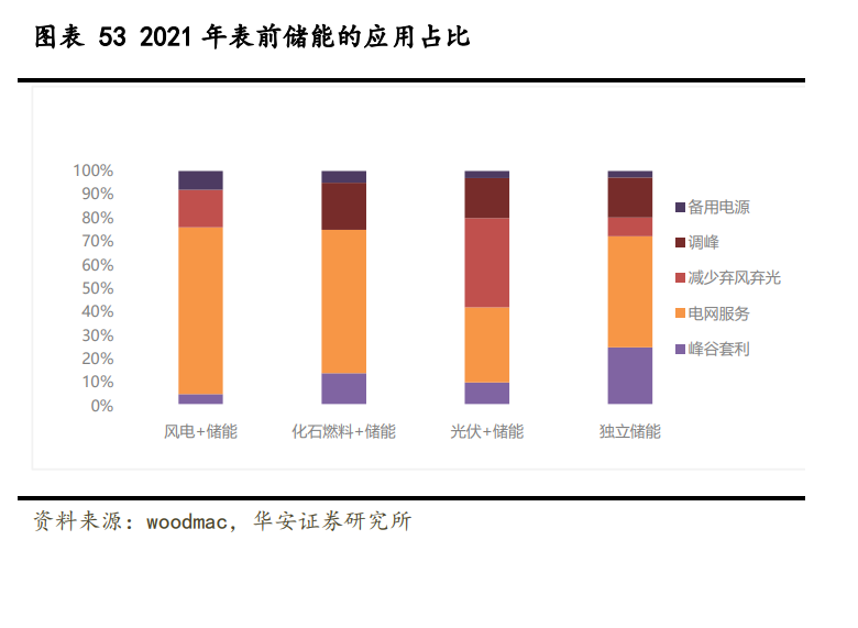 按照是否與新能源電站共址,可將儲能分為獨立儲能和新能源配儲,2020 年之前美 國表前儲能裝機以獨立儲能為主,且主要滿足功率型需求,配儲時長普遍較短,2021 年 起美國表前儲能中新能源配儲的裝機規(guī)模大幅領先獨立儲能。隨著越來越多光伏系統(tǒng)接 入電網(wǎng),預計能量型需求占比將提升,有望驅動表前儲能平均配儲時長提高至 4 小時。 表前儲能的主要作用為電網(wǎng)服務、峰谷套利、調峰、減少棄風/棄光及備用電源,其 中獨立儲能主要側重于電網(wǎng)服務(50%),光伏配儲更側重于減少棄光(40%)。