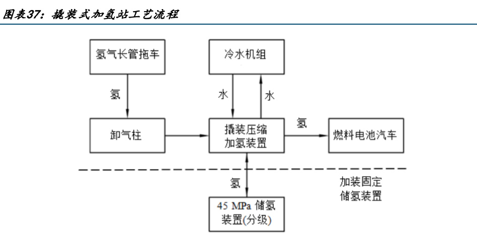 加氫站包含撬裝加氫站、固定式加氫子站、站外管道加氫母站、制氫加氫一體站: 1)撬裝加氫站:可快速完成建設(shè)并在短期投入運(yùn)營 撬裝加氫站通過氫氣長管拖車將壓力不大于 20Mpa 的壓縮氫氣運(yùn)送進(jìn)加氫站,通過卸氣柱卸氣至撬裝壓縮加氫裝置,后增壓為燃料電池車輛進(jìn)行加注(含固定儲氫裝置則先存入儲 氫裝置內(nèi))。