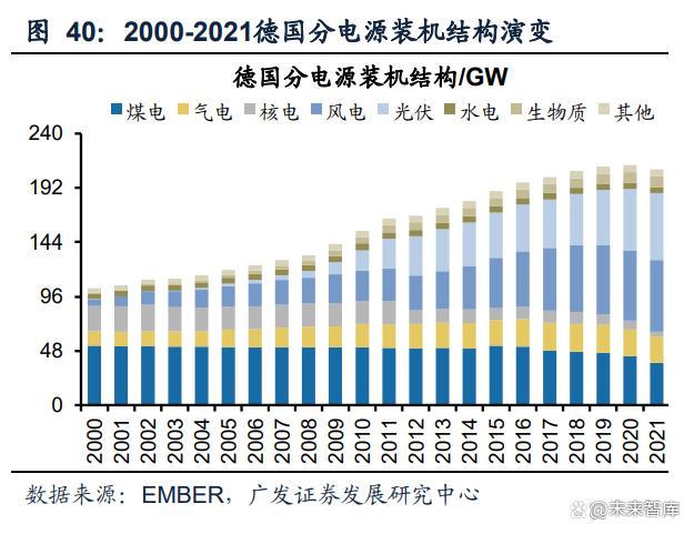 新能源滲透率提升的同時,德國保留一定火電裝機用于調峰。與丹麥不同,德國在 風光發(fā)電量提升的同時,始終保留一定的煤電、并新增一批氣電裝機解決風光消納 問題,這與德國資源稟賦有關,德國是歐盟最大的煤炭產出國,2021年德國煤炭產量占歐盟的38%,這與我國頗為相似。2000-2021年德國煤電和氣電裝機占比從63.3% 降低至29.2%,風光裝機占比從6.0%提升至58.7%,新增裝機主要由風光貢獻。發(fā)電 量結構來看,2000-2021年德國煤電和氣電發(fā)電量占比從61.0%降低至44.6%,風光 發(fā)電量占比從1.6%提升至28.2%,火電仍然保持了一定比例用于調峰。