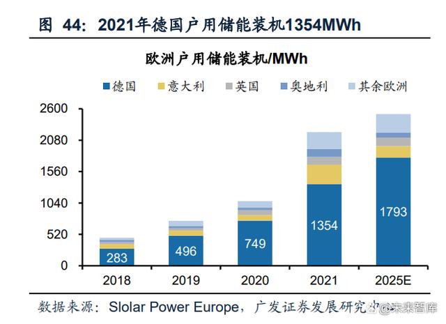 德國除保留火電裝機外,還積極發(fā)展儲能。與丹麥不同,德國用電規(guī)模大,風光消 納面臨形勢更嚴峻,除了保留一定規(guī)模的火電裝機外,德國還積極發(fā)展儲能,儲能 規(guī)模排在歐洲國家前列,同時德國電網跨度大,儲能調度困難,因此重點發(fā)展戶用 儲能,2021年德國戶用儲能占歐洲比例達61%。