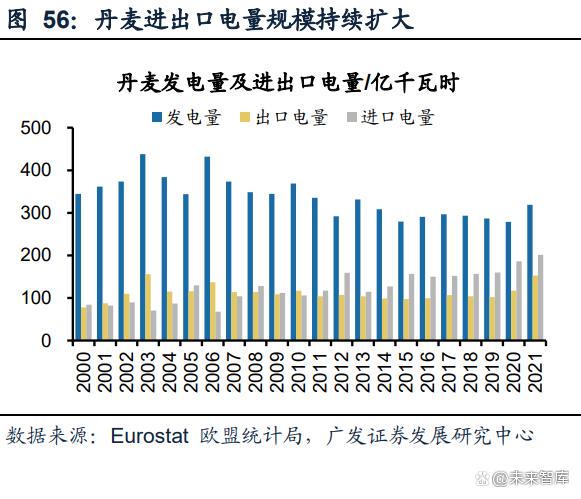 (1)丹麥,以煤為主到以風光為主:2000年煤電發(fā)電量占比超40%,2022年降至 10.5%,風光發(fā)電量占比已超60%,生物質發(fā)電占比23%,丹麥主要依靠與鄰國電網 互聯(lián),挪威和瑞典均是水電富余國家,通過電量進出口調節(jié)國內電量消納,所以風 光占比高仍然沒有出現消納問題;