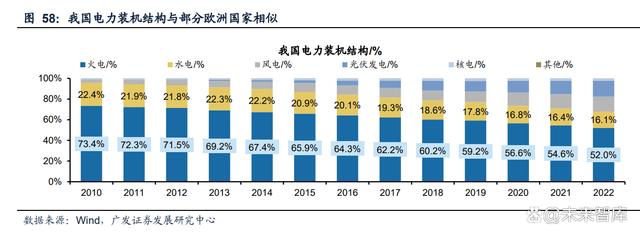 部分歐洲國(guó)家與我國(guó)電力結(jié)構(gòu)相似,能源轉(zhuǎn)型過程值得借鑒。從我國(guó)電力裝機(jī)結(jié)構(gòu)來看,過去我國(guó)以傳統(tǒng)電源火電、水電為主,2010年兩者裝機(jī)占比96%,風(fēng)光等可 再生能源逐漸成為發(fā)展重點(diǎn),水電、火電裝機(jī)占比下降,2022年火電裝機(jī)占比52%, 水電開發(fā)已進(jìn)入后半程增量有限,風(fēng)光成為新增裝機(jī)主力,這與部分歐洲國(guó)家如德 國(guó)、波蘭頗為相似,2022年德國(guó)煤電發(fā)電量占比已經(jīng)降至31%,風(fēng)光發(fā)電量占比提 升至32%,其能源轉(zhuǎn)型走在我國(guó)之前。隨著我國(guó)提出雙碳目標(biāo),風(fēng)光占比提升成為 必然趨勢(shì),德國(guó)等歐洲國(guó)家能源轉(zhuǎn)型過程中的經(jīng)驗(yàn)對(duì)我國(guó)有重要的借鑒意義。