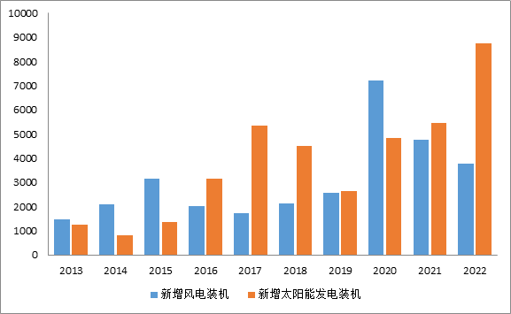 圖9 2013—2022年新增風(fēng)電、太陽能發(fā)電裝機情況(單位:萬千瓦)