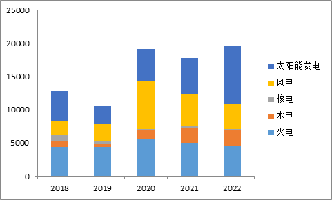 2018、2019兩年新增裝機規(guī)模連續(xù)下滑。2020年,在水電、風(fēng)電、太陽能發(fā)電裝機高速增長的帶動下,新增裝機容量大幅提升。2021年受火電、風(fēng)電新增裝機容量減少的影響,整體新增規(guī)模同比出現(xiàn)下滑。2022年,在火電、核電、風(fēng)電新增裝機增速負(fù)增長情況下,太陽能發(fā)電新增裝機容量增速達約60%,拉高全年新增裝機增速。