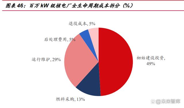 核電在各基荷能源類型中燃料成本占比顯著偏低。核電站具有初始投資高、燃料 費(fèi)用較低的特點(diǎn)。初始建設(shè)投資一般占電站全生命周期的比例為 45-50%,運(yùn)營成本 40-45%,其中燃料采購成本(包括鈾礦開采、鈾轉(zhuǎn)化濃縮、燃料組件制造等前段環(huán) 節(jié))僅占 10-15%。經(jīng)合組織核電站的總?cè)剂铣杀就ǔH為燃煤電廠的 1/3~1/2、為 天然氣聯(lián)合循環(huán)電廠 1/4~1/5。此外值得注意的是,核燃料的后處理成本占核電站全 生命周期成本約 5%,隨著我國核電存量裝機(jī)規(guī)模的擴(kuò)大,乏燃料后處理市場潛力不 容小覷。