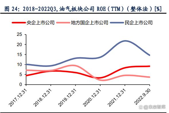 油氣板塊 ROE 數(shù)據(jù)方面,與煤炭,電力板塊不同,油氣民企上市公司總體高于央企和地方 國(guó)企,我們認(rèn)為,這主要是由于以“三桶油”為代表的央國(guó)企的煉油主業(yè)毛利率較低,主要 服務(wù)于國(guó)家戰(zhàn)略;而民企公司主業(yè)以大煉化為主,經(jīng)營(yíng)效率更高,成本更低。根據(jù) 2022 年 三季報(bào),SW 油氣煉化工程板塊,ROE(整體法)為 1.19%;而 SW 煉油化工板塊,ROE (整體法)則為 9.82%。在 PB 估值方面,央企公司顯著低于地方國(guó)企和民企,甚至部分處 于破凈狀態(tài),在未來(lái)估值重塑方面或有更大空間。