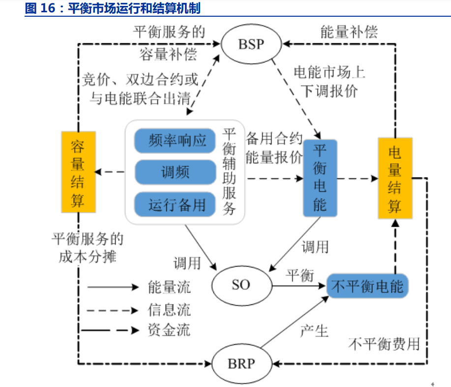 歐洲的平衡市場(chǎng)源于 2017 年 12 月 23 日歐盟委員會(huì) EB 條例,該條例給出一個(gè)指導(dǎo) 方針,使得各國(guó)可以在平衡市場(chǎng)中共享資源,從而使發(fā)電量始終與用電量相等。從實(shí)際達(dá) 成的效果來(lái)看,歐洲平衡市場(chǎng)與我國(guó)的調(diào)頻輔助服務(wù)類似。 在平衡市場(chǎng)中,調(diào)度智能歸于 TSO 或者 DSO,參與平衡市場(chǎng)運(yùn)行和結(jié)算的市場(chǎng)成員 包括 BSP(BalanceServiceProvider,BSP)和 BRP(BalanceResponsibilityParty,BRP) 等。其中 BSP 提供平衡資源,在實(shí)際運(yùn)行中根據(jù)系統(tǒng)頻率變化或調(diào)度指令改變自身出力以 幫助系統(tǒng)恢復(fù)平衡,BRP 是承擔(dān)責(zé)任并參與不平衡結(jié)算的市場(chǎng)成員。