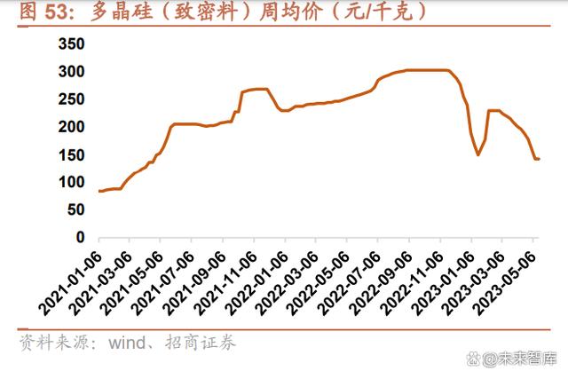 硅料價(jià)格持續(xù)下降,新建產(chǎn)能規(guī)模龐大,有望推動(dòng)光伏裝機(jī)進(jìn)一步增長(zhǎng)。2022 年 12 月開始,隨著硅料產(chǎn)能的逐步釋 放,多晶硅和組件價(jià)格開始大幅回落。2023 年 2 月,硅料價(jià)格出現(xiàn)輕微反彈,主要系需求回暖+開工補(bǔ)庫所致,目前 已重新進(jìn)入下行通道。截至 2023 年 5 月 17 日,多晶硅(致密料)價(jià)格為 143 元/千克,相較 2022 年 11 月 30 日的 高點(diǎn) 295 元/千克下降 51.53%;單面單晶 PERC 組件價(jià)格(182mm)為 1.66 元/瓦,相較 2022 年 11 月 23 日的高 點(diǎn) 1.97 元/瓦下降 15.74%。硅業(yè)分會(huì)表示,2023 年國(guó)內(nèi)多晶硅產(chǎn)量保守估計(jì)有 146 萬噸,加上進(jìn)口多晶硅可達(dá) 156 萬噸,這些硅料已經(jīng)足夠 600GW 光伏裝機(jī),已遠(yuǎn)超 2023 年的全球光伏裝機(jī)量需求,過剩的產(chǎn)能有望推動(dòng)硅料和組 件價(jià)格進(jìn)一步下行,提升運(yùn)營(yíng)商的裝機(jī)意愿。