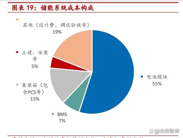 電池為儲能系統(tǒng)第一大成本。儲能系統(tǒng)成本主要由五部分構成:電池模 塊、BMS 系統(tǒng)、集裝箱(含 PCS 等)、土建及安裝費用、其他設計調(diào)試 費。以浙江省一工廠的 3MW/6.88MWh 儲能系統(tǒng)成本為例,電池模塊占總 成本的 55%。