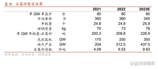石英坩堝是硅片生產(chǎn)過程中的消材,目前尚無替代品。石英坩堝主要應(yīng)用于光伏 及半導(dǎo)體領(lǐng)域的拉晶環(huán)節(jié),是硅片生產(chǎn)流程中的關(guān)鍵材料。在硅棒拉制過程中, 石英坩堝逐步向方石英轉(zhuǎn)化,一定時間后無法使用,需要更換新的石英坩堝,在 硅片環(huán)節(jié)生產(chǎn)過程中具備較強的消耗品屬性。 石英坩堝原材料為高純石英砂,目前與高純石英砂比較相似的產(chǎn)品是合成石英砂, 但因成本及微量元素含量的限制,無法使用于光伏領(lǐng)域。 預(yù)計 2023 年石英砂供需偏緊。需求方面,預(yù)計 2023 年全球光伏裝機 350GW, 假設(shè)每100GW硅片的石英消耗為1.8-2萬噸,則石英砂需求預(yù)計9.3-10.3萬噸; 供給方面,尤尼明+TQC 合計 2.5-3 萬噸產(chǎn)能,石英股份 4.5-5 萬噸,其他產(chǎn)能 合計約為 1 萬噸,供給預(yù)計在 8-9 萬噸。 此外,2023 年海外石英砂占總產(chǎn)能比重約為 35%左右,整體看,行業(yè)內(nèi)石英坩 堝使用壽命會下降,石英砂需求會進(jìn)一步提升,2023 年石英供需緊張相對明確, 漲價時間及幅度可能會超預(yù)期。