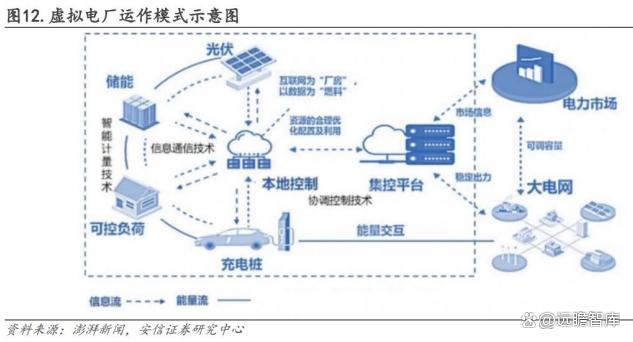 未來隨著電力市場成熟,工商業(yè)儲能也可以通過虛擬電廠以聚合的方式參與電力市場交易。虛擬電廠是應(yīng)用先進(jìn)的通訊和控制技術(shù),實現(xiàn)對大量散布的分布式資源的聚合調(diào)控,使這些分布式資源規(guī)?;?,并具備參與電力系統(tǒng)運行調(diào)度的資格和能力。“虛擬”的含義是這些資源并非真正的發(fā)電廠,而是對分布式資源的聚合,“電廠”的含義是能夠像真正的發(fā)電廠一樣為電力系統(tǒng)提供電能量和輔助服務(wù)。