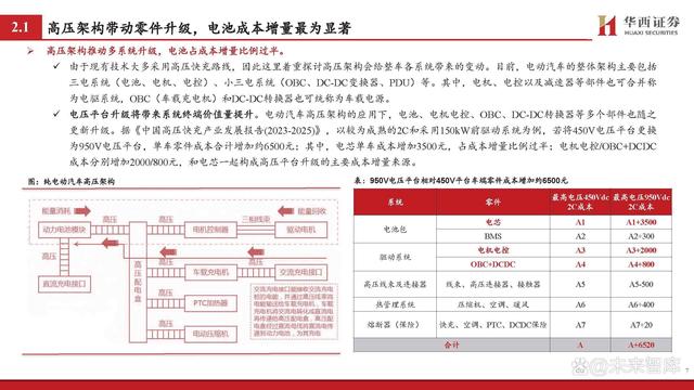 高壓架構(gòu)推動(dòng)多系統(tǒng)升級(jí),電池占成本增量比例過半。 由于現(xiàn)有技術(shù)大多采用高壓快充路線,因此這里著重探討高壓架構(gòu)會(huì)給整車各系統(tǒng)帶來(lái)的變動(dòng)。目前,電動(dòng)汽車的整體架構(gòu)主要包括 三電系統(tǒng)(電池、電機(jī)、電控)、小三電系統(tǒng)(OBC、DC-DC變換器、PDU)等。其中,電機(jī)、電控以及減速器等部件也可合并稱 為電驅(qū)系統(tǒng),OBC(車載充電機(jī))和DC-DC轉(zhuǎn)換器也可統(tǒng)稱為車載電源。 電壓平臺(tái)升級(jí)將帶來(lái)系統(tǒng)終端價(jià)值量提升。電動(dòng)汽車高壓架構(gòu)的應(yīng)用下,電池、電機(jī)電控、OBC、DC-DC轉(zhuǎn)換器等多個(gè)部件也隨之 更新升級(jí)。據(jù)《中國(guó)高壓快充產(chǎn)業(yè)發(fā)展報(bào)告(2023-2025)》,以較為成熟的2C和采用150kW前驅(qū)動(dòng)系統(tǒng)為例,若將450V電壓平臺(tái)更換 為950V電壓平臺(tái),單車零件成本合計(jì)增加約6500元;其中,電芯單車成本增加3500元,占成本增量比例過半;電機(jī)電控/OBC+DCDC 成本分別增加2000/800元,和電芯一起構(gòu)成高壓平臺(tái)升級(jí)的主要成本增量來(lái)源。