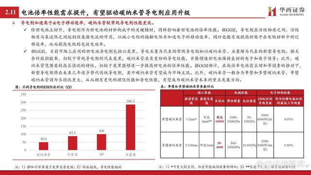 導(dǎo)電劑加速離子&電子移動(dòng)速率,碳納米管較常規(guī)導(dǎo)電劑性能更優(yōu)。除鋰電池主材外,導(dǎo)電劑作為鋰電池的材料構(gòu)成中的關(guān)鍵輔材,同樣影響著鋰電池的倍率性能。據(jù)GGII,導(dǎo)電劑在活性物質(zhì)之間、活性 物質(zhì)與集流體之間起到收集微電流的作用,以減小電極的接觸電阻并加速電子的移動(dòng)速率,同時(shí)也能有效提高鋰離子在電極材料中的遷 移速率,從而提高電極的充放電效率。 據(jù)GGII,目前市場(chǎng)上應(yīng)用的鋰電池導(dǎo)電劑包括以炭黑、導(dǎo)電石墨為代表的常規(guī)導(dǎo)電劑和以碳納米管、石墨烯為代表的新型導(dǎo)電劑。據(jù)天 奈科技招股書,相較于常規(guī)導(dǎo)電劑的代表炭黑,碳納米管具有更好的導(dǎo)電性能,并能夠使鋰電池保持良好的電子和離子傳導(dǎo);此外,碳 納米管憑借其較高長(zhǎng)徑比的特性,相較于炭黑能夠進(jìn)一步提高鋰電池的倍率性能。據(jù)GGII預(yù)計(jì),在高倍率電池需求增加等因素的推動(dòng)下, 新型導(dǎo)電劑將在未來(lái)幾年逐步替代傳統(tǒng)導(dǎo)電劑,其中碳納米管有望成為市場(chǎng)主流。此外,碳納米管一般分為單壁和多壁碳納米管,單壁 碳納米管因?yàn)殚L(zhǎng)徑比更大,從而擁有更優(yōu)的理化性能和導(dǎo)電性能,有望成為碳納米管未來(lái)的重點(diǎn)發(fā)展方向。