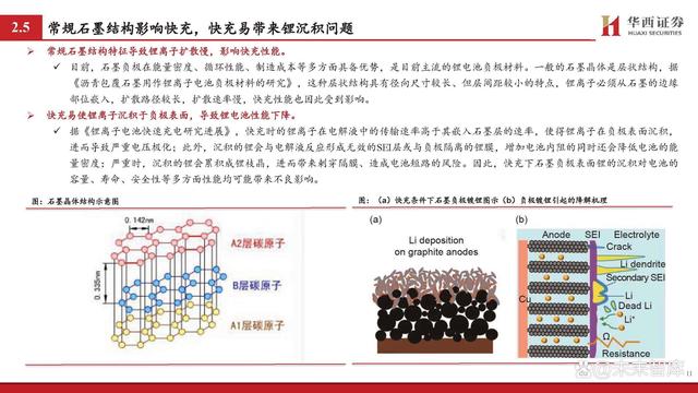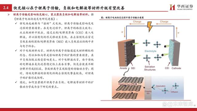 鋰離子傳輸是影響快充核心,重點(diǎn)聚焦負(fù)極和電解液等材料。據(jù) 《鋰離子電池快速充電研究進(jìn)展》: 鋰電池也被稱為“搖椅”式電池,鋰離子傳輸是影響充電 過程的重要因素。在充電過程中,鋰離子的路徑大致為: 從正極材料中脫出,通過正極/電解質(zhì)界面(CEI)進(jìn)入電 解液,并以溶劑化的形式移動(dòng)至負(fù)極,在去溶劑化后穿過 負(fù)極表面的固體/電解質(zhì)界面(SEI)嵌入負(fù)極層狀結(jié)構(gòu)中并 與電子結(jié)合。 對(duì)于電極材料而言,材料內(nèi)部離子傳輸通道及材料顆粒的 形態(tài)、形狀和取向等是影響鋰離子的擴(kuò)散的重要因素,其 中負(fù)極相較正極受影響更大。對(duì)于電解液而言,由于傳統(tǒng) 的電解液在氧化還原穩(wěn)定性上具備劣勢(shì),快充會(huì)使其不斷 分解并形成EEI層,導(dǎo)致鋰離子呈現(xiàn)較慢的傳輸動(dòng)力學(xué);同 時(shí),傳統(tǒng)電解液的溶劑化結(jié)構(gòu)去溶劑化勢(shì)壘較高,對(duì)鋰離 子的擴(kuò)散形成阻礙。 因此,如何顯著提升鋰離子在負(fù)極、電解液等材料中的擴(kuò) 散動(dòng)力學(xué)成為當(dāng)下研究的重點(diǎn)。