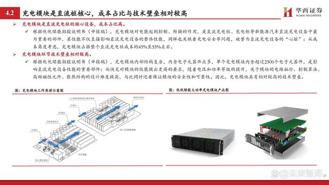 充電模塊是直流充電樁的核心設(shè)備,成本占比高。 根據(jù)優(yōu)優(yōu)綠能招股說(shuō)明書(申報(bào)稿),充電模塊對(duì)電能起到控制、轉(zhuǎn)換的作用,是直流充電樁、充電柜等新能源汽車直流充電設(shè)備中最 為重要的部件,其性能不僅直接影響直流充電設(shè)備的整體性能,同樣也關(guān)聯(lián)著充電安全等問題,被譽(yù)為直流充電設(shè)備的“心臟”;從成 本角度考慮,充電模塊占據(jù)整個(gè)直流充電樁成本的45%至55%左右。