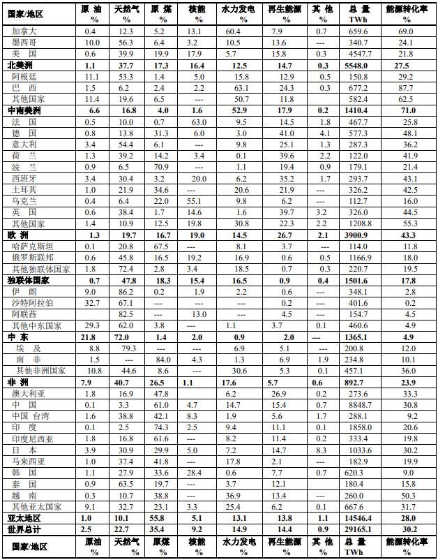 能源結(jié)構(gòu)是指一次能源生產(chǎn)或消費(fèi)的比例,以%表示;而電力結(jié)構(gòu)是指電力來自一次能源的比例。由于各國所處的地理位置不同,資源貧富程度各不相同,甚至相差甚遠(yuǎn),這就構(gòu)成了世界各國各不相同的電力結(jié)構(gòu)。