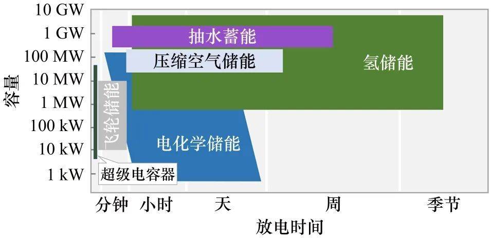 圖1 各類儲能在放電時間和容量性能的對比