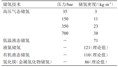 與其他燃料相比,氫的質(zhì)量能量密度大,但體積能量密度低(汽油的1/3000),因此構(gòu)建氫儲能系統(tǒng)的重要前提條件之一是在較高體積能量密度下儲存氫氣。目前,主要儲氫方式可以分為物理儲氫和化學(xué)儲氫。物理儲氫包括高壓氣態(tài)儲存技術(shù)、低溫液態(tài)儲存技術(shù)和地質(zhì)儲氫技術(shù);化學(xué)儲氫包括固態(tài)儲存技術(shù)、有機(jī)液態(tài)儲氫技術(shù)和液氨儲氫技術(shù)。不同儲氫技術(shù)的密度如表2所示。