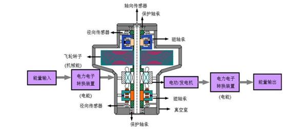 ——工作原理。飛輪儲(chǔ)能的原理是利用過剩電力給真空外殼中的轉(zhuǎn)子(飛輪)加速,把電能以動(dòng)能的形式儲(chǔ)存。在儲(chǔ)能階段,通過電動(dòng)機(jī)拖動(dòng)飛輪,使飛輪本體加速到一定的轉(zhuǎn)速,將電能轉(zhuǎn)化為動(dòng)能;在能量釋放階段,飛輪的旋轉(zhuǎn)速度會(huì)降低,電動(dòng)機(jī)作發(fā)電機(jī)運(yùn)行,將動(dòng)能轉(zhuǎn)化為電能。一般來說,飛輪系統(tǒng)使用電流來控制飛輪速度,其中高能的飛輪使用高強(qiáng)度碳纖維制成的轉(zhuǎn)子,并通過磁懸浮軸承實(shí)現(xiàn)懸浮。這些轉(zhuǎn)子在真空罩內(nèi)的轉(zhuǎn)速可達(dá)到20000-50000rpm,可以在幾分鐘內(nèi)達(dá)到所需的速度。