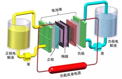 ——工作原理。液流電池通過離子選擇膜的離子交換將化學(xué)能轉(zhuǎn)化為電能,離子選擇膜將兩種液體電解質(zhì)分開存儲(chǔ)在不同的罐中,利用兩種化學(xué)溶液進(jìn)行離子交換來進(jìn)行充放電,其電壓一般在1.0-2.2V之間。與其它電池相似,液流電池的功率與隔膜面積成正比,而儲(chǔ)存能量的多寡和溶液儲(chǔ)存容量成正比。