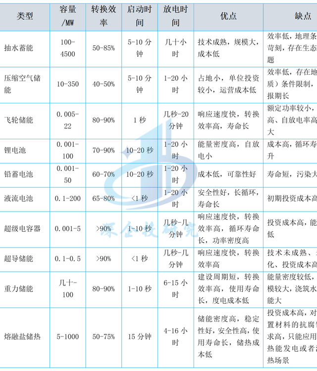 儲(chǔ)能技術(shù)呈現(xiàn)多元化發(fā)展格局,各有不同的應(yīng)用場景。每種儲(chǔ)能技術(shù)均具有一定的獨(dú)特性,在實(shí)際應(yīng)用中,需要用戶綜合考慮各種儲(chǔ)能技術(shù)的特點(diǎn)以及優(yōu)缺點(diǎn),選擇最適宜的技術(shù)方案。比如,飛輪儲(chǔ)能、超級(jí)電容、超導(dǎo)儲(chǔ)能可以解決秒級(jí)或分鐘級(jí)以下的調(diào)頻需求;抽水蓄能、壓縮空氣儲(chǔ)能、燃料電池和電化學(xué)儲(chǔ)能等則更適用于進(jìn)行小時(shí)級(jí)調(diào)峰;氫儲(chǔ)能適合執(zhí)行季節(jié)性調(diào)峰。不同儲(chǔ)能技術(shù)的特點(diǎn)如下表所示。