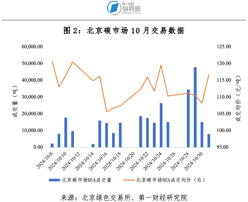 10月北京碳市場(chǎng)碳排放配額(BEA)成交量29.30萬噸,成交額3300.75萬元,成交均價(jià)112.67元/噸。10月最后一個(gè)交易日成交均價(jià)116.73元/噸,較9月最后一個(gè)交易日成交均價(jià)111.47元/噸上漲4.72%。截至10月31日,BEA累計(jì)成交量5704.22萬噸(公開交易2036.05萬噸,協(xié)議轉(zhuǎn)讓3668.17萬噸),累計(jì)成交額30.42億元。